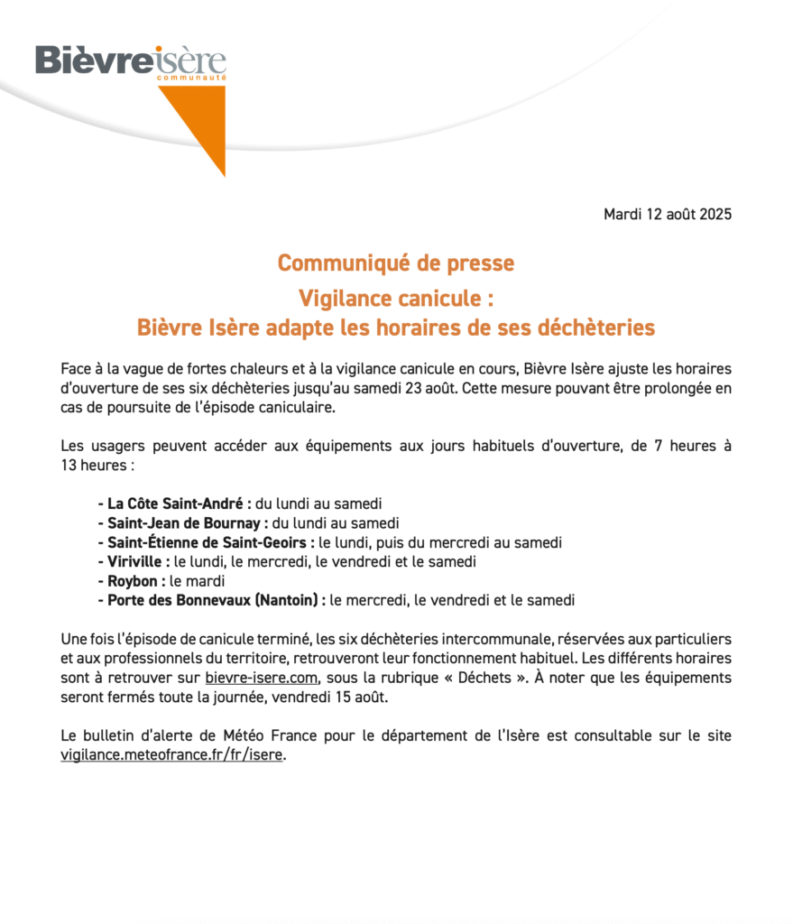 Vigilance Canicule : horaires adaptés pour vos déchèteries ☀️Face à la vague de fortes chaleurs et…