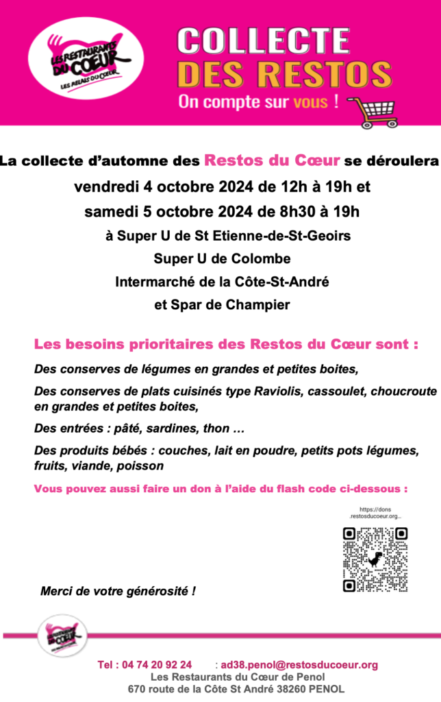 La collecte d’automne des Restos du Cœur se déroulera : vendredi 4 octobre 2024 de 12h…