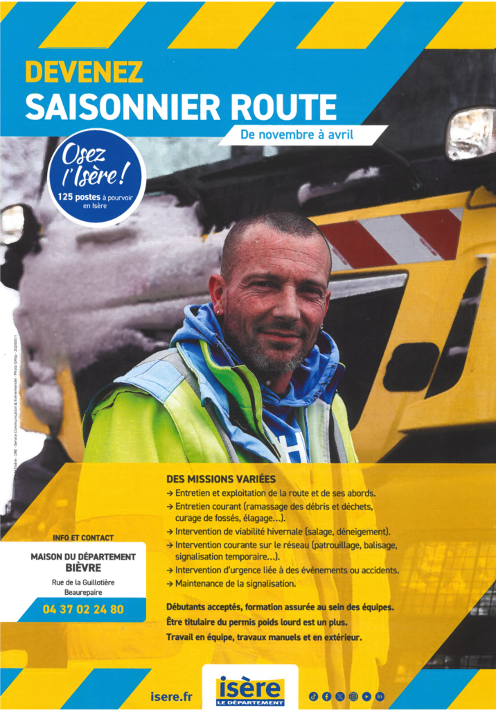 Devenez saisonnier route au Département ! Un poste avec des missions variées : → Entretien et…